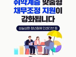 금융위원회는 서민 등 취약계층의 신속한 경제적 재기 지원을 위해, 채무자 특성을 고려한 맞춤형 채무조정 지원을 강화합니다.① 장기연체 취약층② 단기연체 취약층③ 성실상환 청년층④ 취업성공자① 1년