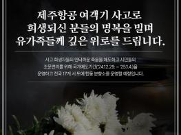제주항공 여객기 사고로 희생되신 분들의 명복을 빌며 유가족들께 깊은 위로를 드립니다.사고 희생자들의 안타까운 죽음을 애도하고 시민들의 조문편의를 위해 국가애도기간('24.12.29.~'25.1.4.)을 운영하