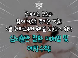첫눈이 내린 12월, 기온이 급격히 떨어지며 진정한 겨울이 찾아왔습니다.?겨울철의 낮은 기온으로 인해 혈관이 수축하고, 혈압이 상승하여 심뇌혈관 질환 발병 소지가 높은데요.?겨울 한파가 찾아오며 위험