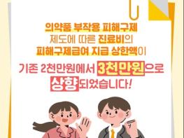 기존에는 의약품 부작용으로 입원치료를 한 경우 그 치료에 드는 비용 중 2천만 원 이하의 범위에서 진료비를 보상해 왔으나,앞으로는, 진료비 지급 상한액이 최대 3천만 원으로 상향되어 보다 충분한 보상