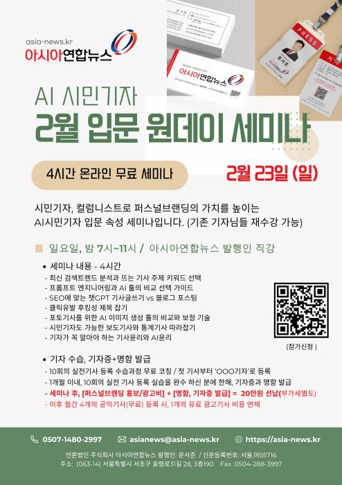언론법인 주식회사 아시아연합뉴스가 시민기자 양성과정을 위한 원데이 속성과정 참가자를 모집한다. 생성형 AI 기술을 활용해 빠르고 쉬운 고품질 기사 작성하여 시민기자로서의 퍼스널 브랜딩 가치와 품격…