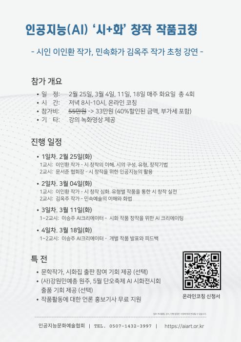 인공지능문화예술협회가 주최하는 ‘AI 시+화 창작 작품준비 코칭’ 프로그램이 오는 2월 25일부터 3월 18일까지 매주 화요일 총 4회에 걸쳐 진행된다. 이번 코칭에서는 AI를 활용한 시 창작 기법과 시각 예…