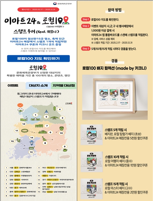 문화체육관광부(장관 유인촌, 이하 문체부)는 더욱 많은 국민이 지역문화 현장을 체험할 수 있도록 이마트24(대표이사 송만준)와 함께 ‘로컬100 스탬프 투어’를 추진하며 본격적인 민간 협력 홍보에 나선…
