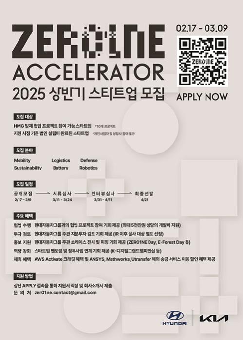 현대자동차그룹이 오픈 이노베이션 플랫폼 ‘제로원’을 통해 우수한 역량을 가진 사외 스타트업을 발굴하는 ‘제로원 액셀러레이터(ZER01NE ACCELERATOR)’의 2025년 상반기 공개 모집을 17일(월) 시작한다…