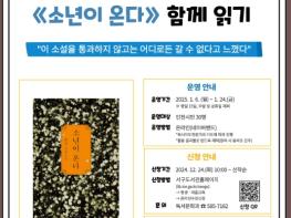 인천광역시교육청서구도서관은 2025년 ‘비대면 함께 읽기’ 프로그램의 첫 번째 도서로 한강 작가의 『소년이 온다』를 선정하여 1월 6일부터 24일까지 운영한다.인천시민 누구나 참여할 수 있는 ‘비대면