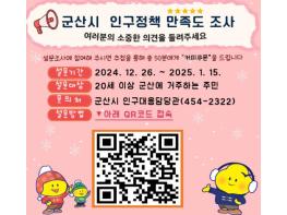 군산시는 맞춤형 인구정책 추진을 위해 시민들의 정책 수요와 의견을 수렴하고자 26일부터 내년 1월 15일까지 20세 이상 군산 시민을 대상으로 인구정책 만족도 조사를 실시한다, 주요 조사 항목은 ▲임신ㆍ