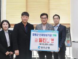 광주은행 함평지점에서 함평군 지역 인재들을 위해 장학금을 기탁하여 연말의 훈훈한 분위기를 자아내고 있다.함평군 관계자는 “24일 광주은행에서 1천만 원을 인재양성기금에 기탁했다”고 밝혔다. 이날