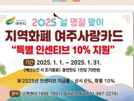 여주시는 2025년 1월 설 명절을 맞이하여 지역화폐 ‘여주사랑카드’ 인센티브를 상시 인센티브 6%에서 특별 인센티브 10%로 확대 지원한다고 밝혔다.1월은 설 명절이 있어 제수용품, 선물세트 등 지출이 많