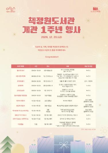 임택 동구청장은 “책정원 개관 첫돌을 맞아 다양한 축하 행사를 준비했으니 많이 찾아와 함께 즐겨 주시길 바란다”면서 “앞으로도 주민들이 가장 친근하게 다가갈 수 있는 문화시설이자 독서문화 소통 공간으로 자리매김할 수 있도록 노력하겠다”고 말했다.