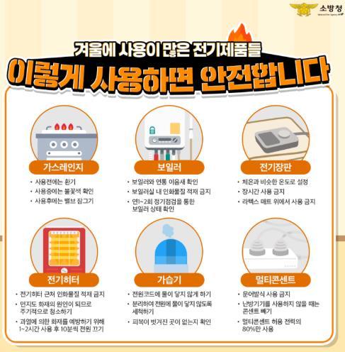 이 밖에도 겨울철 사용이 많은 전기제품 화재예방을 위해 가습기는 전원코드에 물이 닿지 않게 하고, 멀티콘센트는 문어발식 사용을 금지하고 사용하지 않을 때에는 콘센트를 꼭 제거해야 한다.
