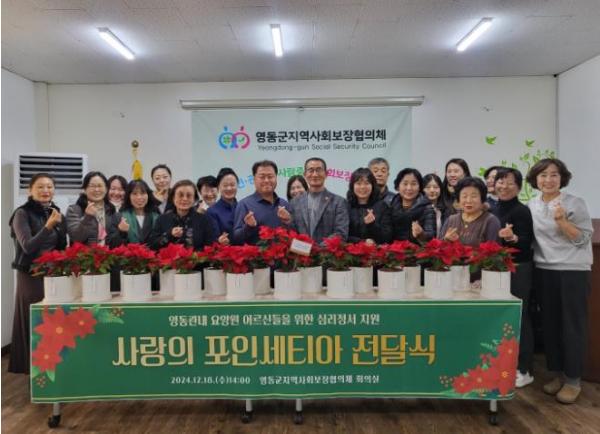 충북 영동군지역사회보장협의체 기획조정분과는 지난 18일 8개 분과 임원진 간담회와 함께 크리스마스를 맞아 영동 관내 20여 곳의 요양원에 화분 나눔 전달식을 진행했다.