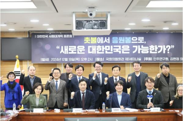 19일 오후 2시 국회의원회관 제1세미나실에서 민주연구원과 김현정 의원실이 공동으로 주최한 ‘촛불에서 응원봉으로, 새로운 대한민국은 가능한가?’대한민국 사회대개혁 토론회를 성황리에 개최했다.