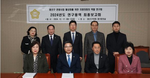 용산구의회는 지난 17일 용산구의회 제1·2회의실에서 ‘용산구 관광사업 활성화를 위한 지방의회의 역할 연구회’, ‘더 나은 세상 연구회’와 ‘용산구 주민친화적 미래 먹거리 의제 발굴을 위한 연구회’까지 총 3개 의원 연구단체의 연구용역 최종보고회를 개최했다고 밝혔다. 이날 최종보고회에서 용산구의원들은 수행기관으로부터 각 연구단체의 연구용역 최종보고를 듣고 질의응답을 통해 심도있게 논의하는 시간을 가졌다.