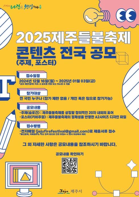 현경호 관광진흥과장은 “이번 공모전이 다시 시작하는 2025년 제주들불축제에 대한 대중의 관심과 공감대가 커지는 계기가 되길 바라며, 재능있는 분들의 많은 참여를 부탁드린다”고 전했다.