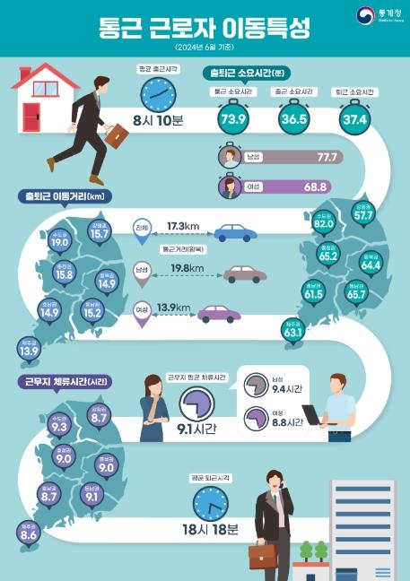 출·퇴근을 위해 평균적으로 73.9분 동안 17.3㎞를 이동했으며, 소요시간과 이동거리 모두 수도권이 가장 길었음