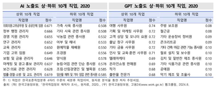 반면, AI와 GPT 노출도가 낮은 하위 직업군은 농부, 목축업자, 어업 종사자, 환경미화원, 건설현장 노동자 등이다. 이들 직업군은 물리적 노동이나 현장 중심의 작업을 주로 포함하고 있어 기술로 대체하기 어려운 특징을 가지고 있다. 특히 이러한 직업군은 자동화의 경제성이 낮거나 인간의 감각적 판단이 필요한 경우가 많아, AI 기술의 영향을 상대적으로 덜 받을 것으로 보인다.