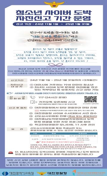 대전경찰청과 대전자치경찰위원회는 최근 심각한 사회 문제로 대두되고 있는 청소년 사이버 도박 문제 해결을 위해 12월 23일부터 관내 중·고등학교를 직접 방문하여 ‘리-본(Re-Born) 상담소’를 운영한다고 밝혔다.