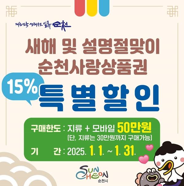 순천시는 다가오는 새해와 설 명절을 맞아 2025년 1월 1일부터 1월 31일까지 순천사랑상품권을 15% 할인된 가격에 판매한다고 밝혔다.