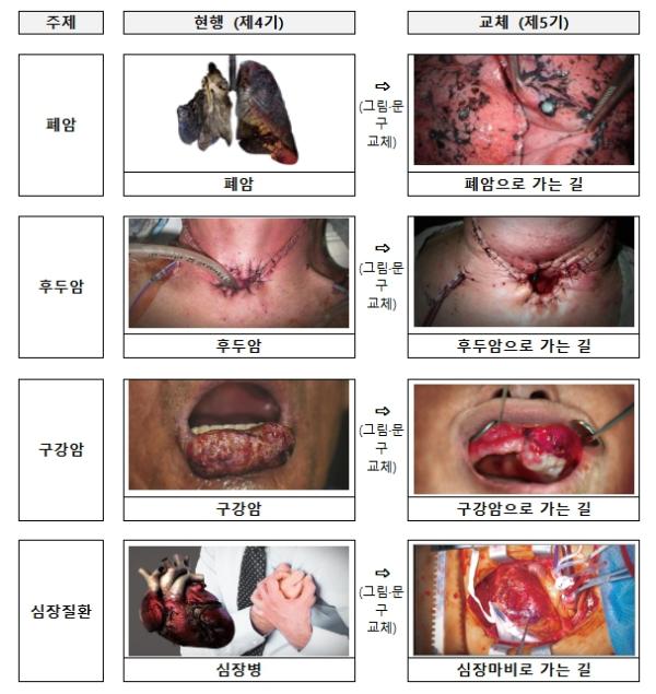 보건복지부는 지난 6월 21일 고시 개정을 통해 최종 확정된 제5기 담뱃갑 건강경고 그림·문구를 6개월 유예 기간을 거쳐 12월 23일부터 새롭게 적용한다고 밝혔다.