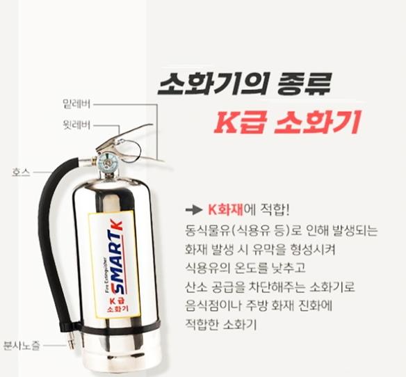 K급 소화기는 동식물유(식용유)로 인한 화재 발생 시 기름막을 형성시켜 식용유의 온도를 낮추고 산소 공급을 차단해 음식점이나 주방에서 발생하는 화재에 적합한 소화기이다.