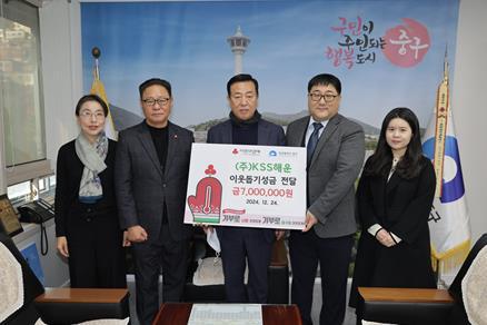 ㈜KSS해운에서 24일 부산 중구를 방문하여 이웃돕기 성금 700만원을 기탁했다.