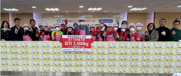 병영새마을금고가 12월 24일 오전 10시 30분 병영새마을금고 대회의실에서 대한적십자사 울산광역시지사를 통해 중구에 1,100만 원 상당의 이웃돕기 김장 김치 10kg 250상자를 전달했다.