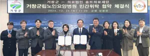 거창군은 24일 군청 상황실에서 구인모 군수, 솔트의료재단 임은희 이사장 및 김일환 예성요양병원장 등 관계자가 참석한 가운데 거창군립노인요양병원 민간위탁 협약 체결식을 가졌다.
