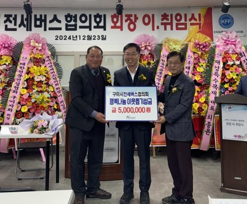 경북전세버스조합 구미시협의회는 지난 23일 임원과 회원사 대표 등 50여 명이 참석한 가운데 제7대 회장 이·취임식 및 기부금 전달 행사를 열었다.