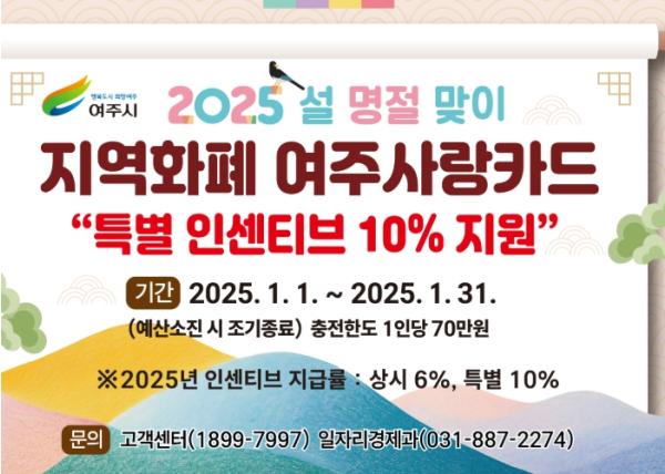 여주시는 2025년 1월 설 명절을 맞이하여 지역화폐 ‘여주사랑카드’ 인센티브를 상시 인센티브 6%에서 특별 인센티브 10%로 확대 지원한다고 밝혔다.