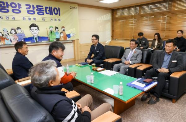 정인화 광양시장은 ▲다압취수장 관련 죽천마을 규제 해제 건의 ▲토석채취장 허가 관련 피해 대책 마련 ▲주택 옆 옹벽·주차장 조성으로 인한 피해 호소 ▲관내 유기질비료업체의 사업·수출 지원 및 관급자재 구매 요청 등 건의 사항에 대해 의견을 나누고 시민, 관계 부서장 등과 함께 해결책을 고민했다.