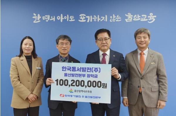 한국동서발전(주) 울산발전본부가 24일 울산광역시교육청에 장학금 1억 20만 원을 전달했다.