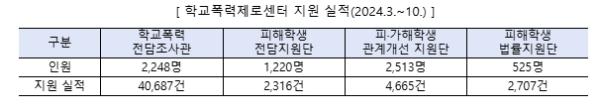 또한, 피·가해학생에 대한 지원단의 밀착 지원도 이뤄지고 있다. 퇴직 교원·경찰 및 심리상담가 등으로 구성된 ‘피해학생 전담지원단’이 피해학생과 일대일로 상담하여 실질적으로 필요로 하는 부분을 확인한 후 전문기관과 함께 연계 지원하고 있다. 화해·분쟁조정 전문가·교원 등으로 구성된 ‘피·가해학생 관계 개선 지원단’은 화해와 관계 회복 등 교육적 해결을 위한 관계 개선 프로그램을 운영하고 있다.