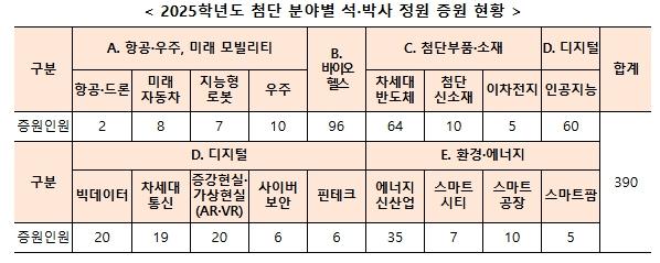 교육부는 석?박사급 첨단분야 인재 양성을 위해 2025학년도에 수도권 소재 첨단분야 대학원 정원 390명을 증원한다고 밝혔다.