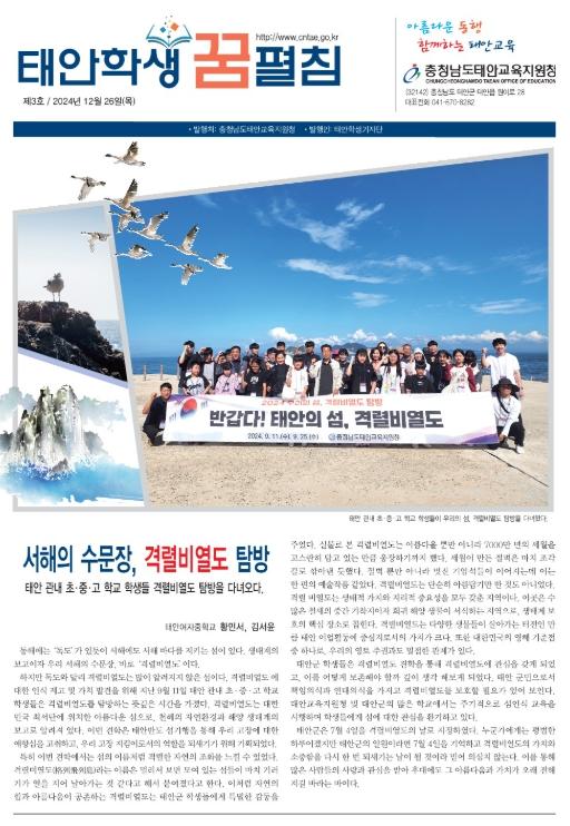 이번에 발행된 ‘태안 학생 꿈 펼침 3호’는 ▲격렬비열도 탐방 ▲우리 이야기 들어볼래? ▲교육 현장 생생 정보 ▲교육과 사람 ▲토닥토닥 상담소 ▲네 꿈을 펼쳐라 ▲울림이 있는 마당 ▲초록지구 만들기 ▲꿈틀 전시회 ▲별별 이야기 등 다양한 기사가 실렸다.