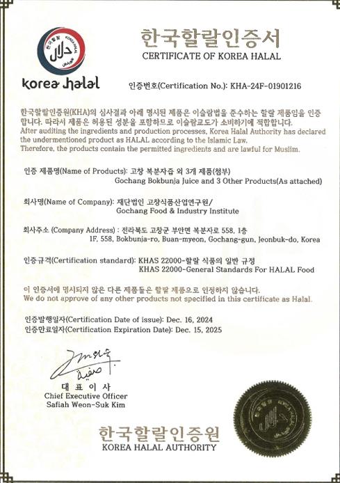 재)고창식품산업연구원 농식품가공센터가 최근 한국할랄인증원(KHA)으로부터 고창 복분자즙 등 4개 제품에 대해 할랄 인증을 획득했다고 밝혔다.