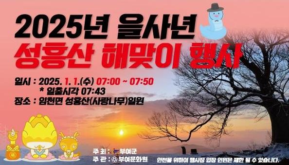 부여군은 2025년 을사년 '푸른 뱀의 해'를 맞아 군민의 소망과 행복을 기원하며 ‘함께 만드는 더 큰 부여’라는 비전을 새롭게 다짐하는 성흥산 해맞이 행사를 개최한다.
