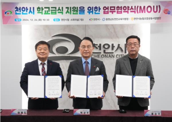 천안시는 지난 24일 천안시교육지원청, 천안시농협조합공동사업법인과 ‘학교급식지원센터의 효율적인 운영’을 위한 3자 업무협약을 체결했다.