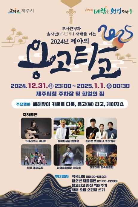 제주시는 2024년을 마무리하고 희망의 을사년(乙巳年) 새해를 맞아, 제주시민의 무사 안녕을 기원하는 제야의 용고타고 행사를 12월 31일 밤 11시에 제주시청에서 개최한다.