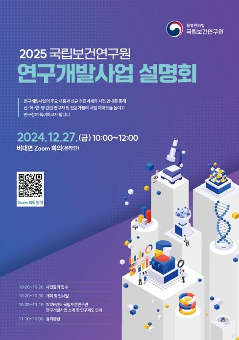 질병관리청 국립보건연구원은 ‘2025년 국립보건연구원 국가연구개발사업 설명회’를 12월 27일 10시부터 개최한다고 밝혔다.