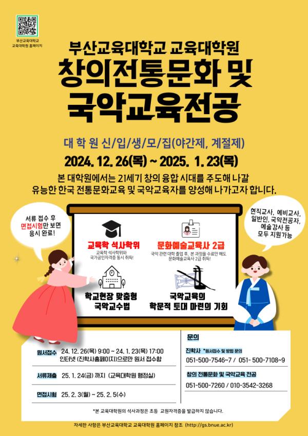 부산교육대학교 교육대학원이 창의적 전통문화 교육과 국악교육의 미래를 이끌어갈 인재 양성을 위해 ‘창의전통문화 및 국악교육전공’ 신입생 모집을 실시한다.