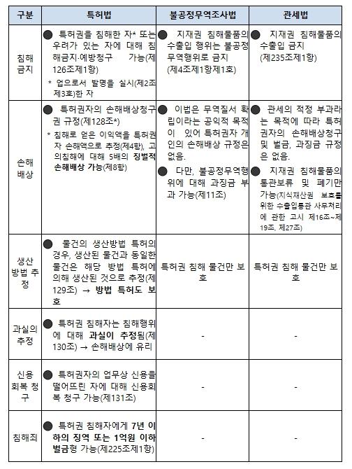 관세법이나 불공정무역행위 조사 및 산업피해구제에 관한 법률(‘불공정무역조사법’)에서는 특허침해 제품이 수출되는 것을 세관에서 막거나 과징금을 부과할 수는 있지만, 손해배상청구 또는 침해죄 등의 적극적인 보호가 규정되어 있지 않았다.