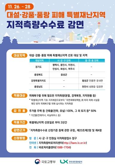 충남도는 대설·강풍 피해로 인해 특별재난지역으로 지정된 천안시 성환읍과 입장면 주민들을 위해 지적측량 수수료를 최대 100% 감면한다고 29일 밝혔다.