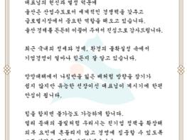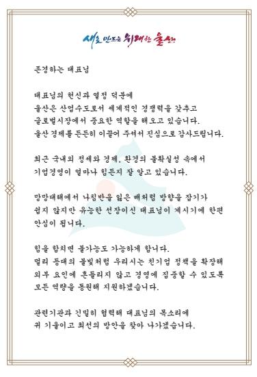 김두겸 울산시장은 서한문을 통해 “울산은 훌륭한 지도자(리더)들과 기업의 열정 덕분에 산업수도로서 세계적인 경쟁력을 갖추고 세계(글로벌) 시장에서 중요한 역할을 해오고 있다”라며 지역 경제를 든든히 이끌어준 기업에게 감사를 표했다.