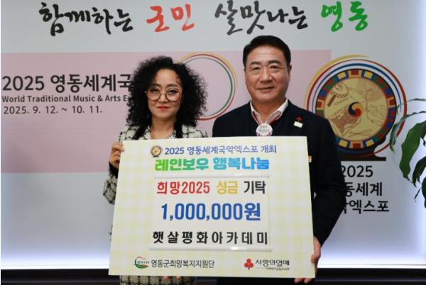 30일 햇살평화아카데미은 영동군에 성금 100만 원을 기탁하며 사랑의 온도를 높였다.