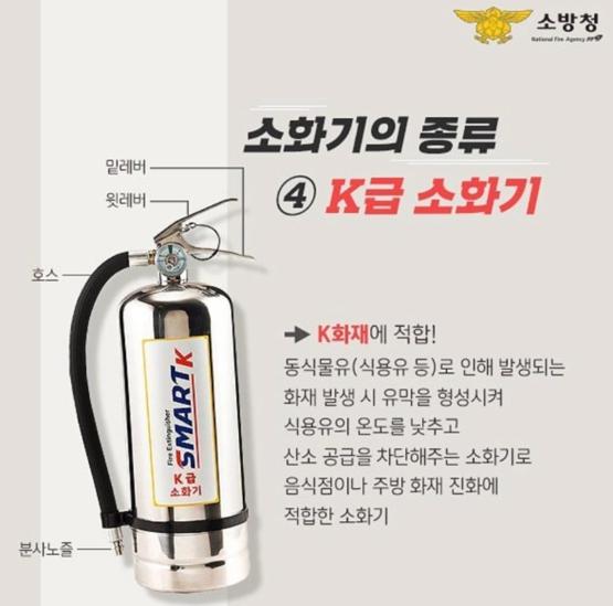 K급 소화기는 동식물유(식용유)로 인한 화재 발생 시 기름막을 형성시켜 식용유의 온도를 낮추고 산소 공급을 차단해 음식점이나 주방에서 발생하는 화재에 적합한 소화기이다.