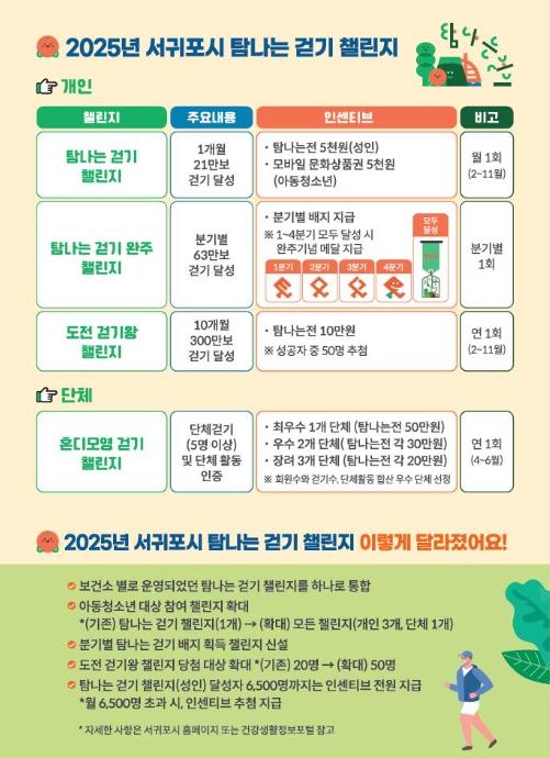 이번 사업은 지난해 걷기 챌린지 사업을 통해 서귀포시 걷기 실천율이 2023년 29.2%에서 2024년 42.4%대로 크게 상승하며 시민들의 뜨거운 호응을 얻은 바, 내년에도 걷기를 일상 속 건강습관으로 정착시키고 지역사회의 건강문화를 더욱 확산할 수 있기를 기대하고 있다.