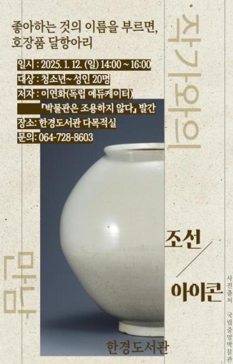 '달항아리' 강연 참여를 희망하는 대상자는 12월 29일부터 제주특별자치도 공공도서관을 통해 접수하면 된다.
