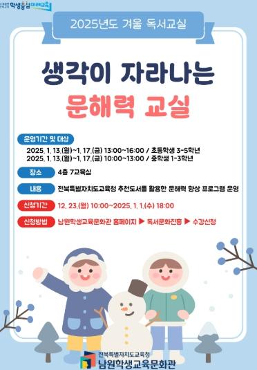 전북특별자치도교육청남원학생교육문화관은 지역 학생들의 독서활동 지원 및 문해력 향상을 위해 ‘생각이 자라나는 문해력 교실’을 주제로 2025년도 1월 13일부터 1월 22일까지 2025년도 겨울 독서교실을 운영한다.