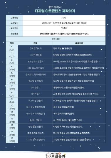 특강은 2025년 1월 2일부터 2월 27일까지 매주 화요일과 목요일 오후 2시부터 4시까지 여주시립 폰박물관에서 열린다. 수업은 박물관 제공 태블릿 또는 개인 태블릿을 활용해 진행되며, 디지털 콘텐츠 제작 과정에 필요한 기초 지식과 실습을 아우른다.