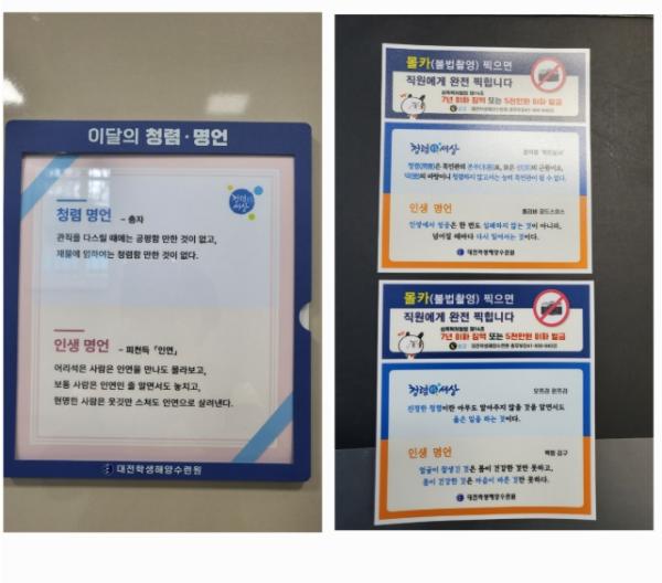 대전학생해양수련원은 생활 속 청렴문화 정착을 위하여 수련원 내 화장실에 이달의 청렴·명언 홍보판 및 스티커를 제작하여 부착했다고 밝혔다.
